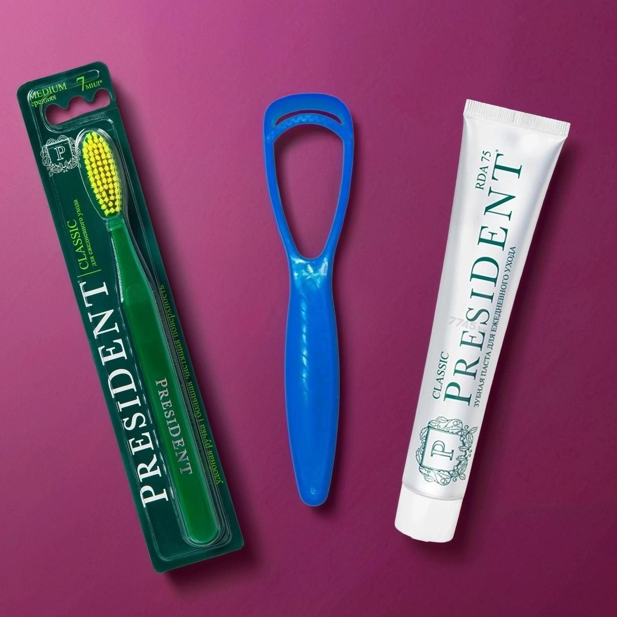 Зубная паста Президент + щетка Президент + скребок для языка 1) Зубная паста для ежедневной защиты от кариеса PRESIDENT Classic Состав Aqua, Sorbitol, Hydrated Silica, Xylitol, Glycerin, Tetrapotassium Pyrophosphate, Cellulose Gum, Sodium Lauroyl Sarcosinate, Aroma, Titanium Dioxide, Sodium Fluoride, Chamomilla Recutita Extract, Salvia Officinalis Extract, Mentha Piperita Extract, Sodium Methylparaben, Menthol, Sodium Saccharin, CI 42090, CI 19140. Способ применения Небольшое количество пасты нанесите на зубную щетку. Чистите зубы в течение 2-ух минут 2) Зубная щетка PRESIDENT Classic Medium (средней жесткости) Для тех, кто предпочитает качественный уход каждый день Большая головка обеспечивает быстрое очищение внешних, внутренних и жевательных участков зубного ряда. Закругленные нейлоновые щетинки Medex деликатно полируют зубную эмаль и не травмируют десны. Специально подобранная жесткость щетины (7 мил*) позволяет эффективно очищать зубной налет, а также предотвращает образование зубного камня. 3) Скребок для чистки языка Торглайнс Скребок изготовлен из прочного высококачественного пластика, не травмирующего мягкие ткани полости рта. Он не раздражает слизистую и эффективно удаляет налет с языка. Чистка языка с помощью скребка от ТОРГЛАЙНС очень проста. Проведите скребком по поверхности языка несколько раз, двигаясь от задней части к передней. После использования скребок следует промыть теплой водой Цвет – синий